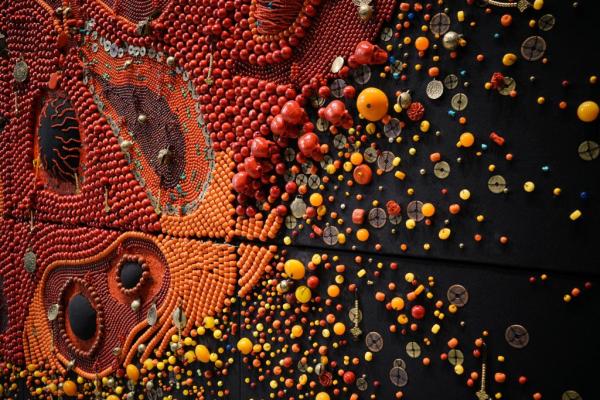 展厅的一楼,一幅巨大的《红太阳》悬挂在墙壁上,和驻足的观众形成对比。这幅作品来自中国西藏艺术家嘎德,他将各种材质与颜色的佛珠缝制在黑色的手工牦牛绒布上。“佛珠与藏人的信仰相联。牦牛绒布与藏人的日常生活关联。”噶德说道。而在这幅作品中,佛珠不再作为精神媒介,而更接近于物质世界。“我想要提出的问题是,在如今这个时代,我们如何面对自己动荡的内心。”