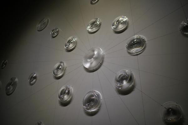 沿着一楼展厅的坡道走向二楼,便来到艺术家石至莹的作品面前。这件名为《圆光》的作品由一组不同大小的菲涅尔透镜组成,圆形的透镜依据一定的方位秩序组合。“作品中的方位来自一张曼荼罗上佛像的方位图,但内容从绘画换成了圆形的透镜。”展览现场,石至莹向“澎湃新闻”(www.thepaper.cn)记者描述了她作品的灵感来源。“透镜其实是二维的,但因为光的折射,呈现出三维凸透镜的效果。由此我想表达的是,眼见不一定为实,真假并不确定,这使我去反省我们已有的认知。”