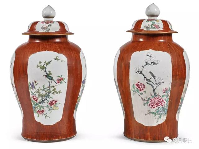 清十八世纪 粉彩仿木纹釉开光花卉图盖罐一对