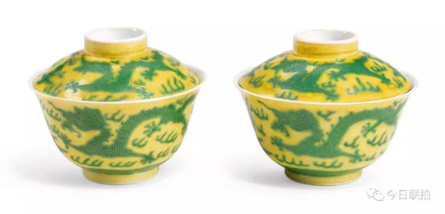 清光绪 黄地绿彩赶珠游龙纹盖盌一对