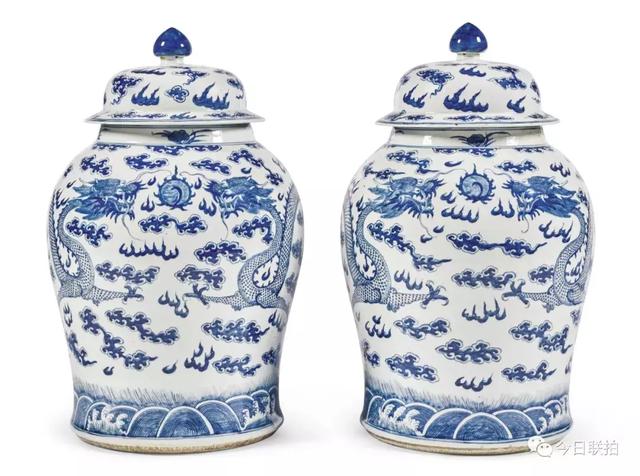 清十九世纪 青花赶珠云龙纹盖罐一对
