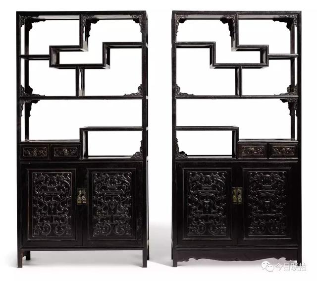 清 硬木螭龙瑞蝠纹亮格柜一对