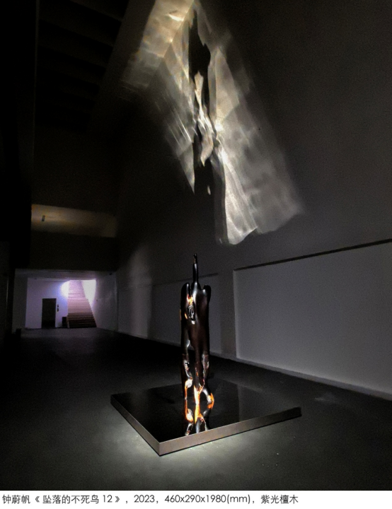 钟蔚帆的“爻”系列雕塑静静地立在展厅里,紫光檀木的肌理在灯光下流淌着时间的光泽。“坠落的不死鸟”系列那个永恒的悬停姿态,恰是中国艺术在全球化语境中处境隐喻:在西方艺术话语与市场逻辑的双重压力下,如何保持文化创造的自主性?“坠落的不死鸟”斜倚的角度暗示着永恒的悬停,或刨开表皮露出的火焰纹木色与黑漆形成强烈的对比,是生命之光的闪耀。“玄女”系列的孔洞仿佛呼吸的通道,飞升于九天之上的精神图腾,“冥想”作品则构筑了由团块、曲线形成的精神空间,引导进入一种沉默的不可言空间。