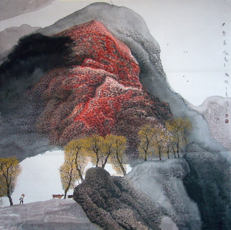 太行山水是李清江先生多年观察写生和反复探索创造从而成为他驾轻就熟的题材,然而他仍兢兢业业从事创作,不论大小幅都认真推敲。他创造了自己的风格样式,堪称独步。为了绘制太行之景,他曾多次到太行山,对太行作进一步观察、研究、探索和搜集,通过一点一滴的写生过程,以心接物,深刻感受,真正实践了“师造化”的主张,从而也就激活了他领会掌握的传统艺术思想和技法,面对现实,较好地完成中西艺术的融合。正因为李清江对艺术的一丝不苟,勤奋实践,使我们会心于他作品中甚至是局部的细节处也画得十分具有情趣,耐人寻味。比如画面中顾盼有致的黄牛,跨越石桥的山民,还有那上下翻飞的小鸟,点活意境,带来诗意。同时,也淋淋尽致地表现了画家高远的心性,。。。