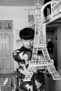 女友一直很向往去巴黎看埃菲尔铁塔,宝鸡文理学院大三男生陈旭辉就用3000支竹签搭建成了90厘米高的一个竹签版的埃菲尔铁塔。