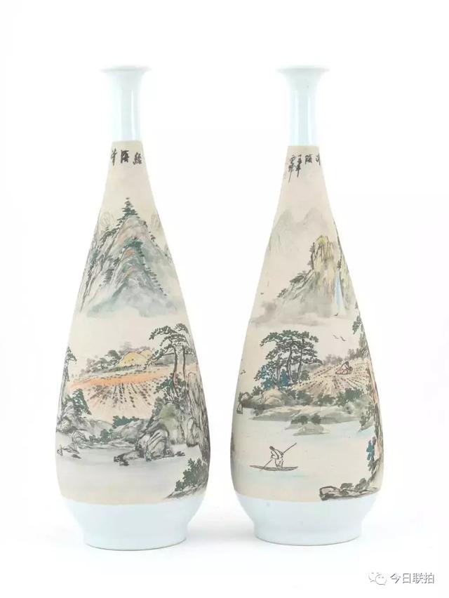 山水纹玉壶春瓶一对