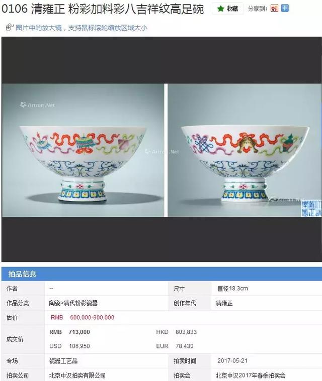 这件藏品是我的一个朋友从新加坡一位老藏家手里当民国的东西淘出来的,我这个朋友平时玩杂项多,瓷器相对比较少,淘回来后就拿过来跟我探讨,我一上手就被它整体的气质给征服了,上手手感非常舒服,釉面紧致,用彩描绘十分工整,彩料搭配丰富流畅,画工规规矩矩一丝不苟,很典型的雍正官窑气派!我如实告知朋友捡漏这应为雍正本朝官窑,而非民国时期后仿,朋友甚为激动,最后为表示感谢,让我参股送拍,2017年在北京中汉以71.3万的价格拍出,这故事告诉自己,多交良师益友,将心比心总有回报!