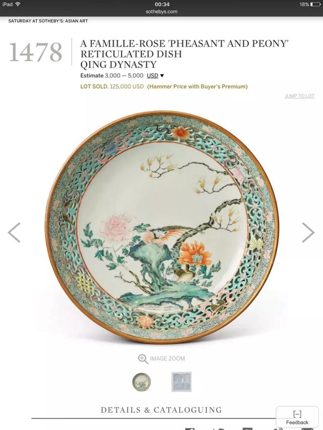 这件藏品是在英国乡村的小拍上以较低的价格竞得的,第一眼看到它的时候就被它那华丽的色彩,精致的造型,和细腻的描绘所吸引,根据自己的经验判断,这肯定是一件非官即富的人家才会拥有的藏品,当时就暗下决心一定要拿下,好在那天抢的人不多,以一个低于自己预估价的价格拿下,然而今年纽约春拍上就出现了一件几乎一样的拍品,最后以12.5万美金的价格售出,合人民币大约80几万吧,不知不觉中我好像又捡了个漏,哈哈!