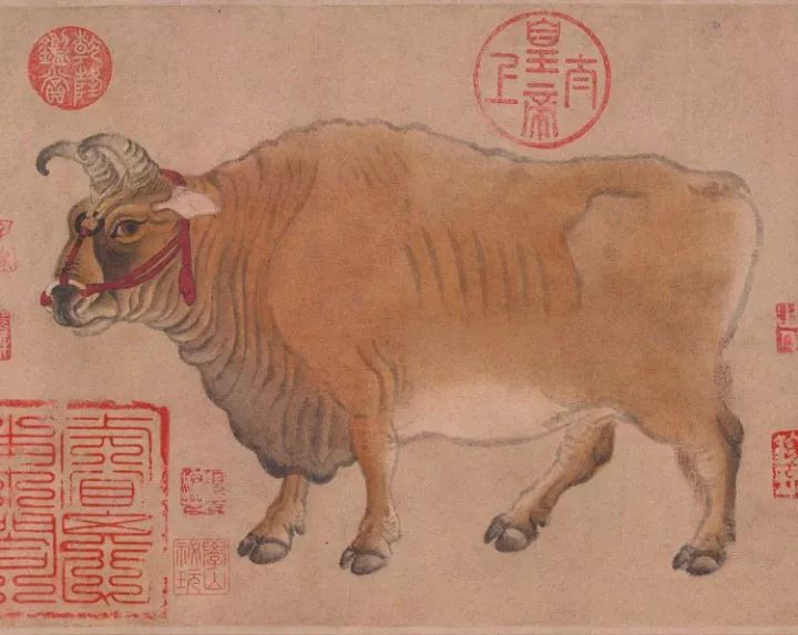 《五牛图》不仅让我们一睹1300年前唐代画家的高超技艺,也看到唐朝时期高超的造纸技术。这个乾隆可不能错过,乱七八糟盖了不少的印章,你看画面,牛添堵的表情,这让憨厚的牛情何以堪啊。