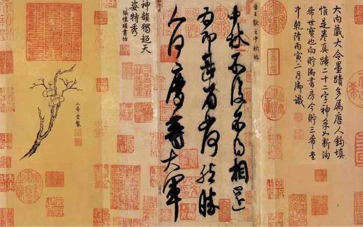 老爸的作品被糟蹋完,儿子的作品也惨遭毒手。王羲之儿子王献之的《中秋帖》享受到了皇上同样的礼遇——弹幕章。千秋书法神品,就这样被搞成了大妈准备的结婚床品——要红、要艳、花样多、不能有空白,方能显出我的雍容华贵。