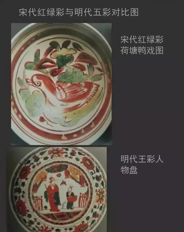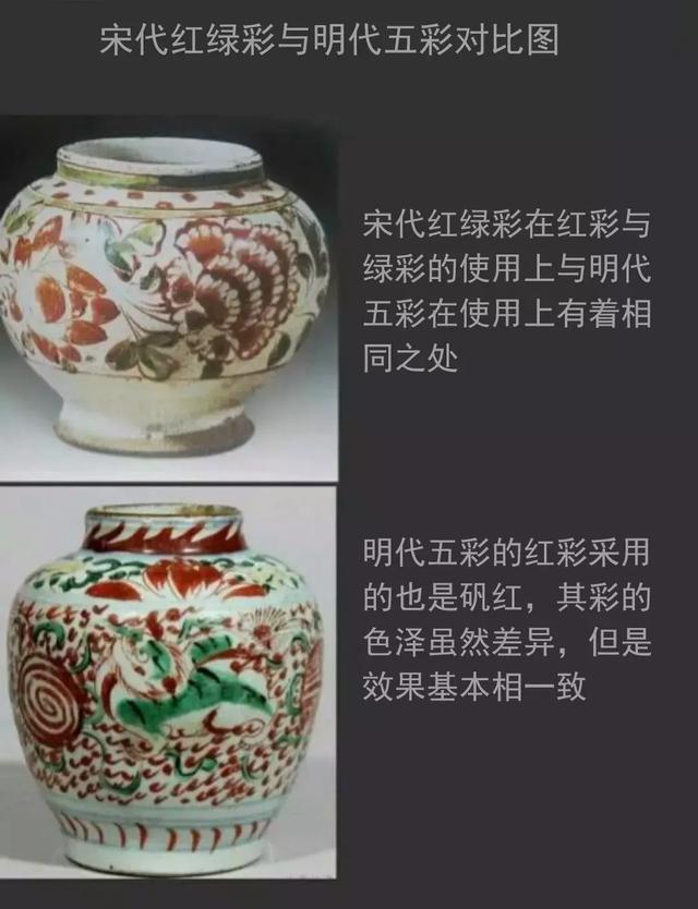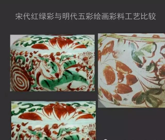 明清两代的斗彩与清代的粉彩都采用了以铅为助溶剂的方法,这样与宋代的红绿彩中的铅的使用方法是一致的。第二,明清斗彩与清代粉彩都是采用了釉上施彩的方法,并且都是先烧好素坯胎,然后二次上彩,采用低温烧制的方法。这同宋代红绿彩的烧制方法完全一致,说明了这种技术是有传承关系的。