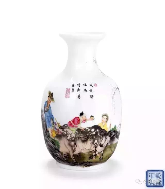 民国 珐瑯彩牧牛童子图诗文瓶