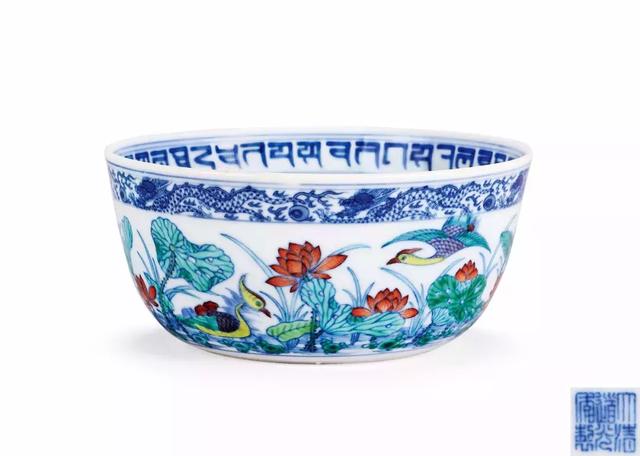 清道光 斗彩荷塘鸳鸯纹墩式碗