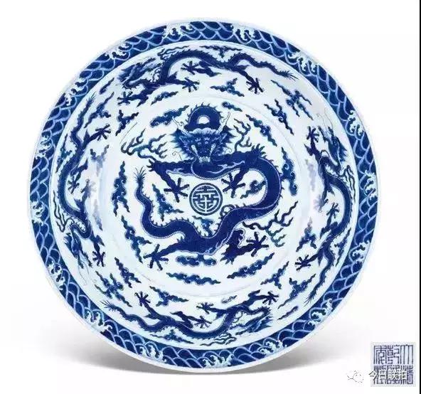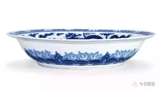 亮点拍品清乾隆青花海水云龙寿字纹折沿盘拍得380万港元,顺利拿下本场第一名。此盘敞口,折沿,弧壁,盘心双弦线内绘五爪苍龙一只,捧寿字跃然凌于祥云之间。内壁为四组飞云腾龙,绕盘心一圈,气势磅礡。大盘折沿处饰青花海水纹一周;外壁沿圈足绘江崖海水纹一周。整器画风雄浑,威严霸气;各组纹饰之间过渡自然,又相互关联,远观仿佛海水澎湃扑打江崖之上,飞龙旋动游走祥云之间,气韵生动,风格华丽。