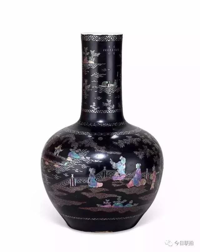 清乾隆 黑漆嵌螺钿竹林文仕图天球瓶