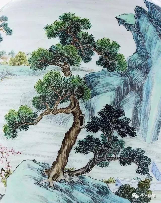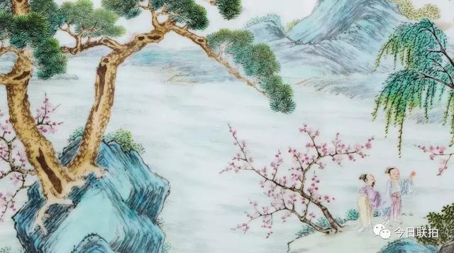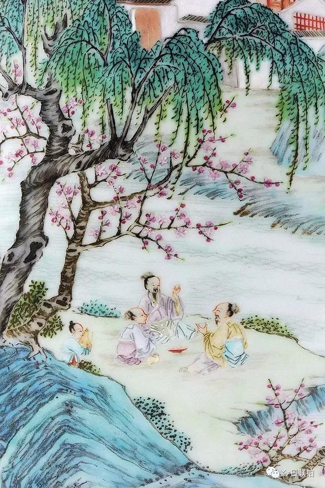 乾隆一朝继往开来,是陶瓷史上取各代所长集大成的时代。相较于前朝瓷器上以青花或釉上五彩绘制的通景画,因洋彩色料明快艳丽,深浅有度,玻璃质感中又透出浓郁的油彩感,加之景德镇画工在乾隆一朝施彩时运用西方绘画技法,使得乾隆洋彩器上呈现出的画面勾染皴擦,浓淡分水,立体感强,为陶瓷史上通景画的一无可超越的巅峰。