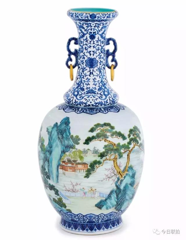 此瓶颈足均以青花装饰,上绘缠枝花卉间以螭龙纹,下呈如意云头纹与莲瓣纹,画工细腻,发色深浅有度,活灵活现,为乾隆青花中的佳品。颈上一对螭龙耳各坠一原配金彩圆环,保存完好,殊为难得。器身细绘“桃花源”通景图,细品此洋彩图,似是一幅山水画卷从纸上跃然瓶身,达成从平面至立体的完美转换。
