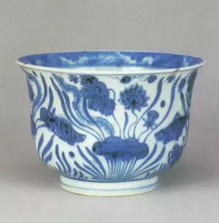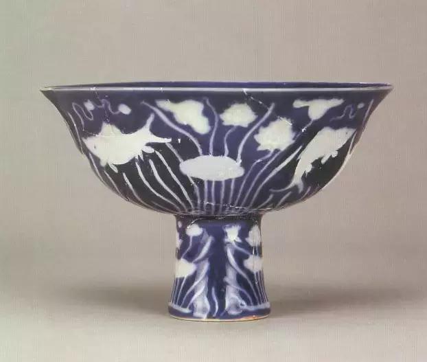 明宣德蓝地白鱼藻纹高足碗