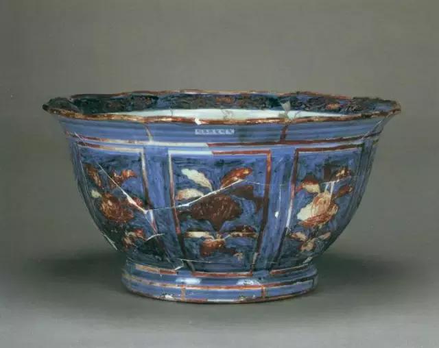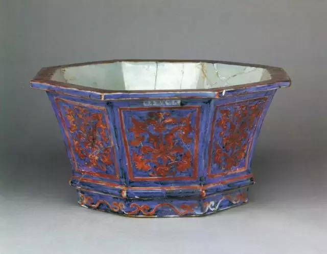 明宣德青花填红八边形花钵