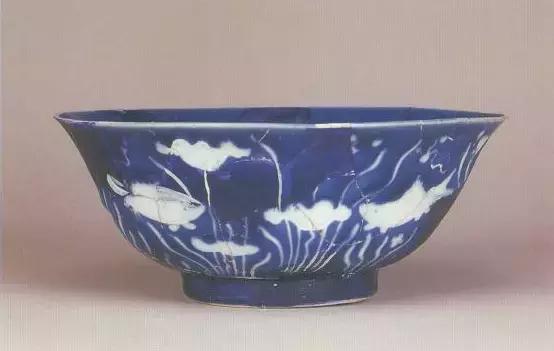 明宣德蓝地白鱼藻纹碗