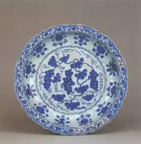 明宣德青花葡萄纹菱口纹盘