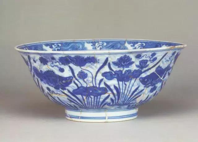 明宣德青花鱼藻纹金钟碗