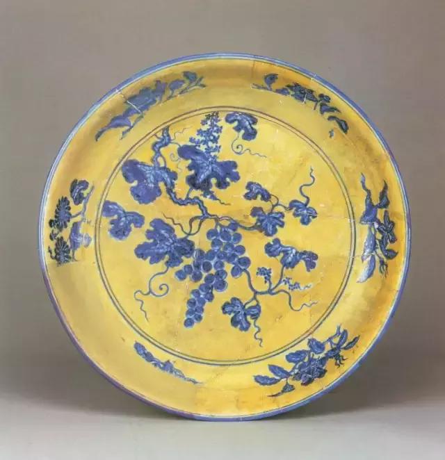 明宣德黄地青花葡萄纹盘