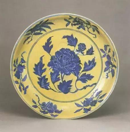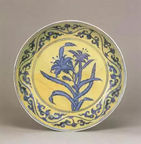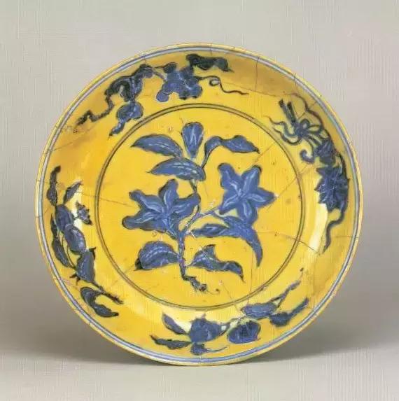 明宣德黄地青花萱草纹盘