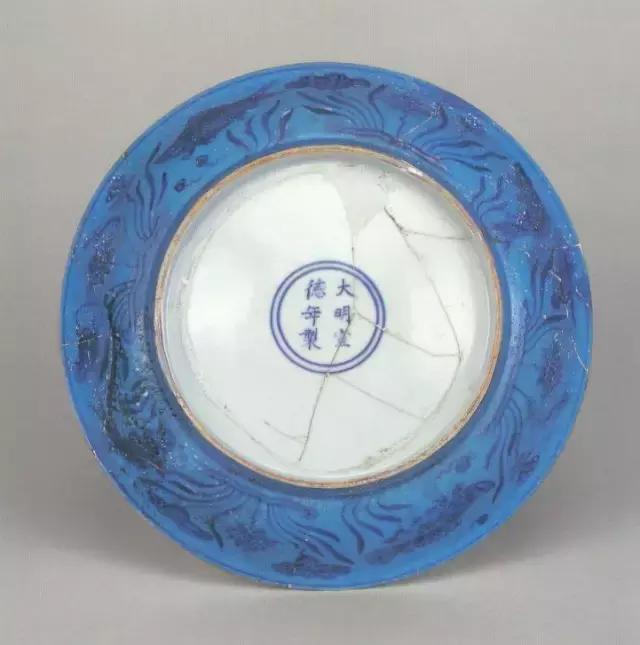 明宣德孔雀绿釉青花鱼藻纹盘