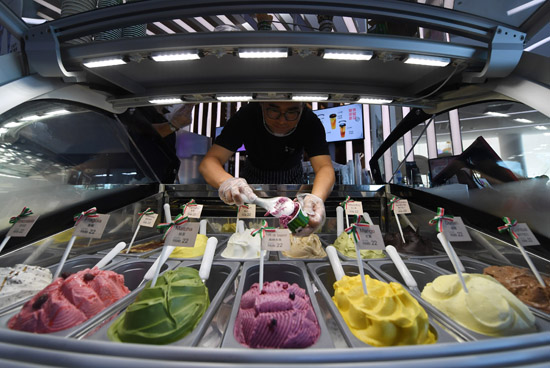 8月31日,一名顾客正在挑选色彩各异的冰淇淋。(图片来源:本文图片来源均来自中新社)
