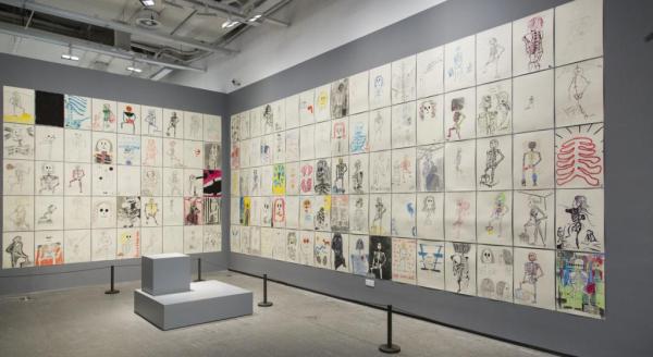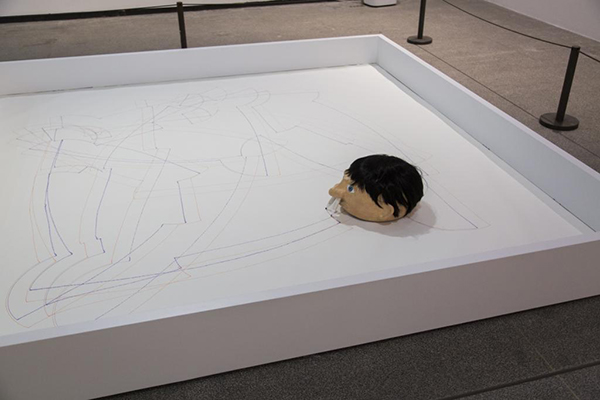 《艺术家》,2014年,电动机器人、笔、纸,尺寸可变,2017年日本水户艺术馆展览现场,由艺术家和伦敦斯蒂芬·弗里德曼画廊收藏,摄影:Keizo Kioku,©David Shrigley