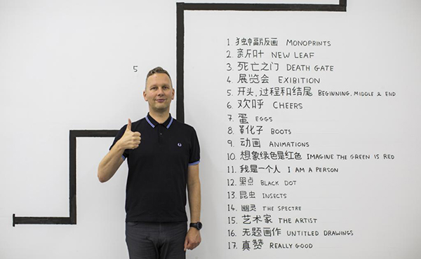 1米97的艺术家大卫·史瑞格里站在他写的展览指示图前