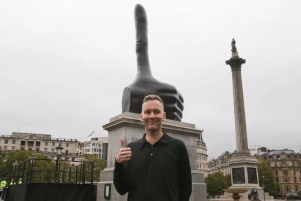 2016年,大卫·史瑞格里在第四基座前与作品《真赞》合影 ©Photo Daniel Leal-Olivas/AFP/Getty Images