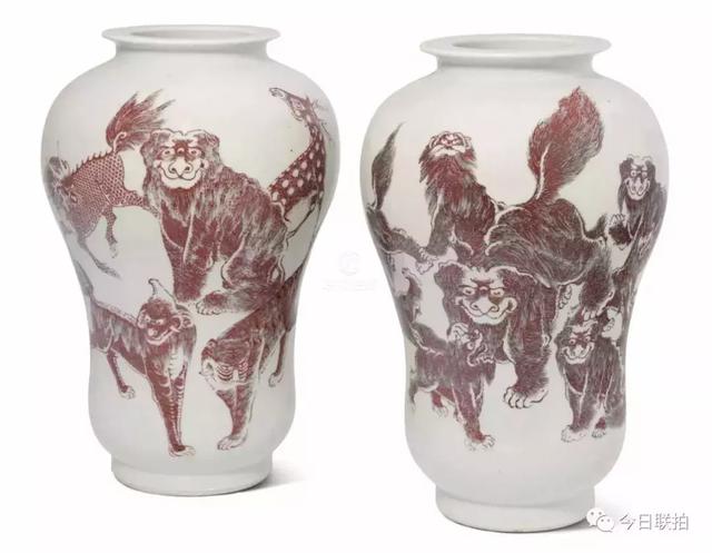 清 釉里红瑞兽纹梅瓶一对
