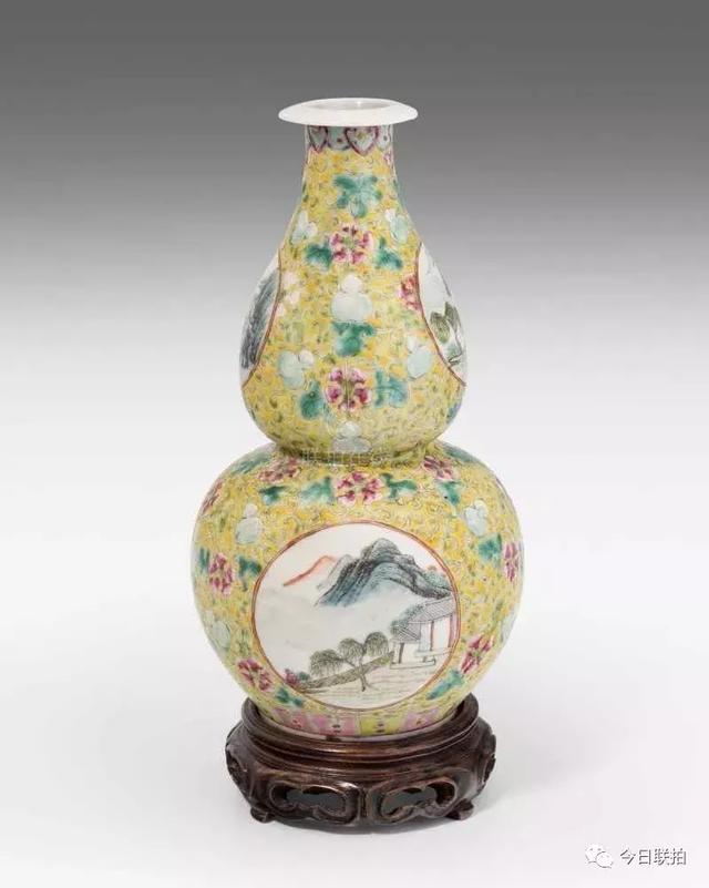 粉彩开光山水文葫芦瓶