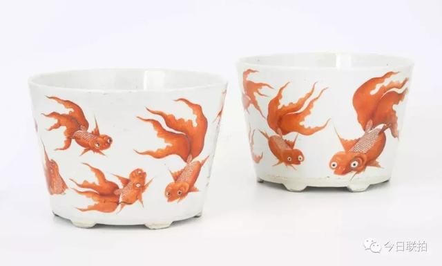 清 矾红彩金鱼纹杯一对