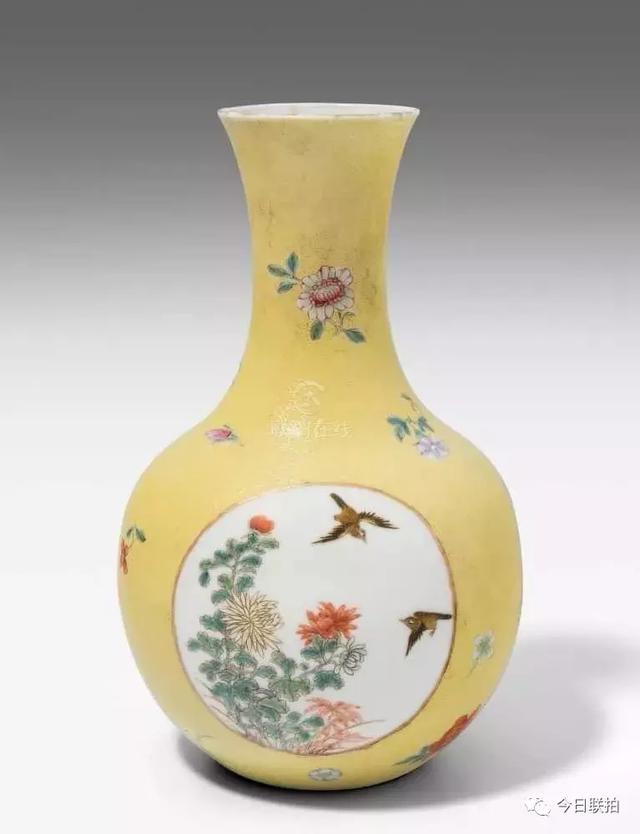 黄地粉彩花鸟纹小瓶