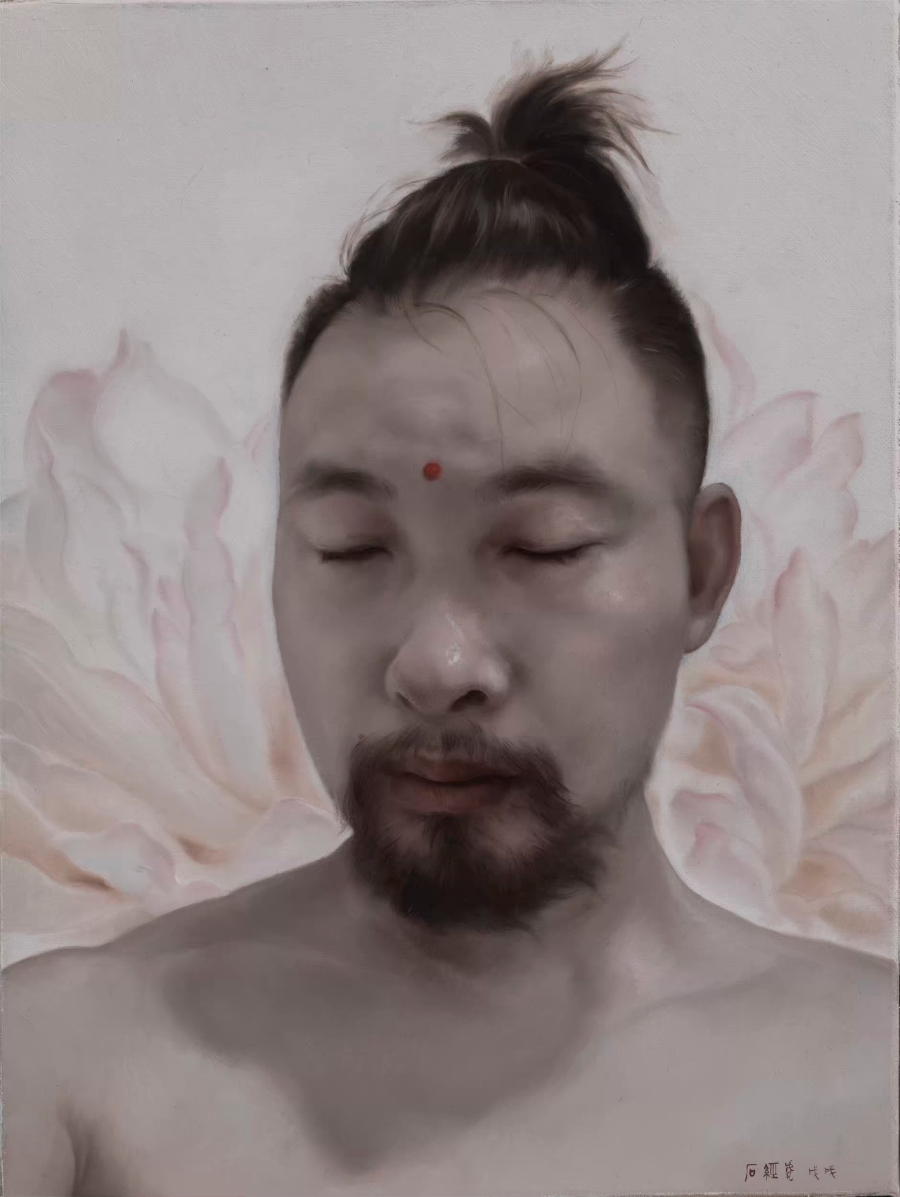 石经虎先生是位厚重而不喧哗的艺术家,不傲不炫,画画几乎是他的全部生活内容。他透过古典大师伦勃朗那样的视野,重审当代人的外貌表情。在人像画上加兔耳,加鹿角,加上男人婚纱和花环,或许有他对现实的隐喻和象征,也或许有他揭示现实尘封的哲理追求。