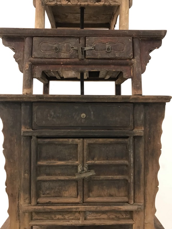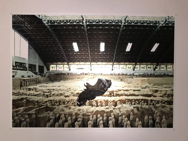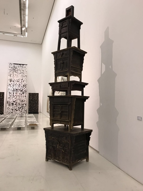 突出“与西安对话”的作品在此次展览的主展厅中显而易见。其中,共有5位艺术家创作了7件作品来表现西安标志性建筑之一的大雁塔,如奚建军的《达达塔》、邵译农的《叠罗汉》、杨千的《天梯》等。邵译农的《叠罗汉》是用清末、民国时期的旧家具做成的一个大雁塔的一个造型,力求用传统家具的素材来突出西安的文化标志。而杨千的《天梯》则是恰恰相反,这件作品利用在北京城乡结合部的民工厂房里所收集来的废旧钢铁,铸造了的一个大雁塔形象的天梯;其实他用这些新的材料也在隐喻着老百姓的辛苦与勤劳。