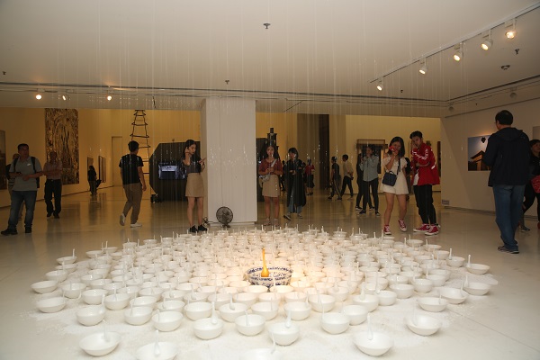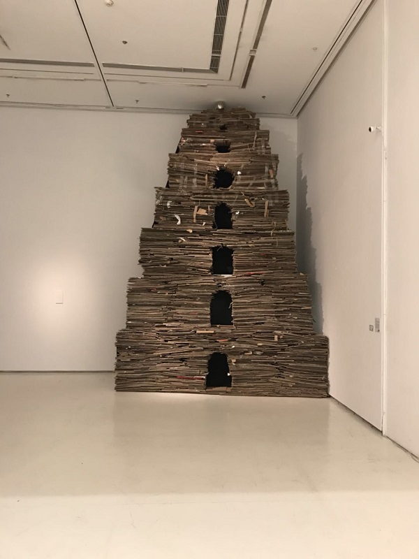 奚建军的《达达塔》则是用廉价的包装纸箱所堆积而成的一座大雁塔的造型。这件作品不是一个简单的视觉作品,堆积的纸箱里还增加了一些声音,包括音乐、新闻、广播等,反映了当下幸福祥和的市井生活状态,以此来营造一种传统建筑与现代数字传媒的碰撞氛围,探讨传统与当代、文化与生活混合在一起的语境。