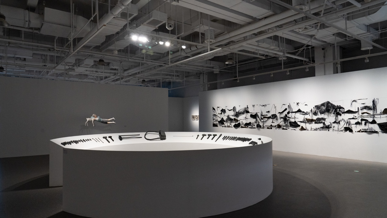 从而也说明,丁密金的水墨人物绘画根本不是某个现实场景的再现,也不是我们在保护地球家园时采取的某些措施,反而造成了一种带有欺骗性的意味。例如画面描绘的那些似乎是被纠结和缠绕的人体骨骸,实际折射着现实生活中的各种人物组合,而且更像是在一片破败的废墟或屠宰场中没有生命体征的人体组合,显然是在预想我们赖以生存的地球家园在过多的欲望和诉求中遭到破坏之后所形成惨痛结局。所以,我认为丁密金的水墨人物绘画是一种理性的思考和批判。