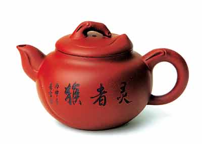 张瑞端颠覆过去的创作思路,以桃子为形进行大胆塑造,壶把、壶钮老干苍劲借喻桃树,壶盖、壶流桃韵盎然,壶体敦庞而线条灵动,壶身是张春雷雕刻的灵猴瓦当图腾来点题,再配上他铭刻的“灵者猴”,使该壶创作内涵寓意其中,用寿桃为壶形充分体现“猴桃瑞寿”之感,使《灵者猴》壶寓意天成。