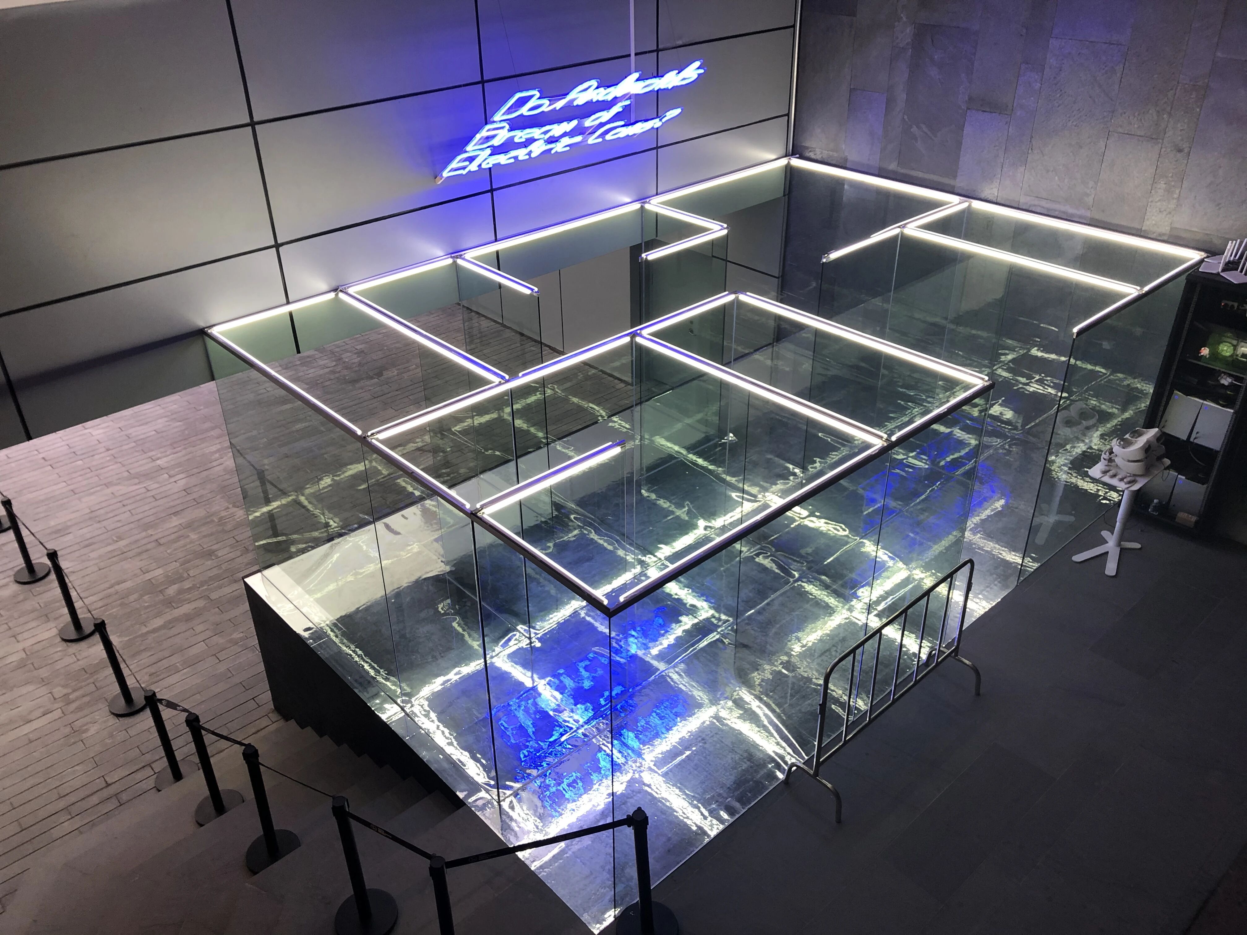 戴上眼镜的人们被眼前的虚拟空间诱导,很自然地往前走,这时展览现场的体验区是由有机玻璃建造的迷宫,让人在虚拟世界摸索的同时不得不应对现实的困境。有趣的悖论就这样出现了:VR设备的发明和使用意在使人完全沉浸于虚拟世界中,而置身其中的玻璃迷宫又让人在碰壁的时刻,不断提示这一切都是假象。沉浸和出离的反复切换,撕扯出现实和虚拟的裂痕。