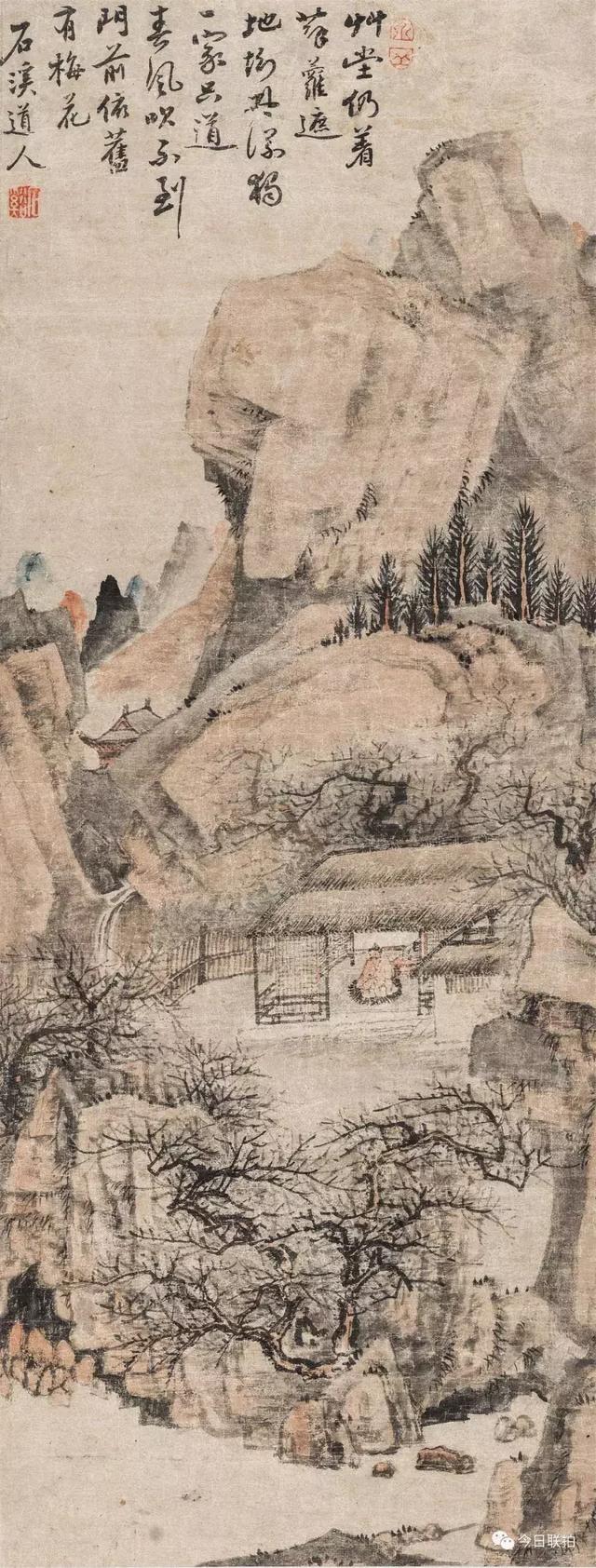 款识:草堂仍着薜萝遮,地拗林深独一家。只道春风吹不到,门前依旧有梅花。石溪道人。