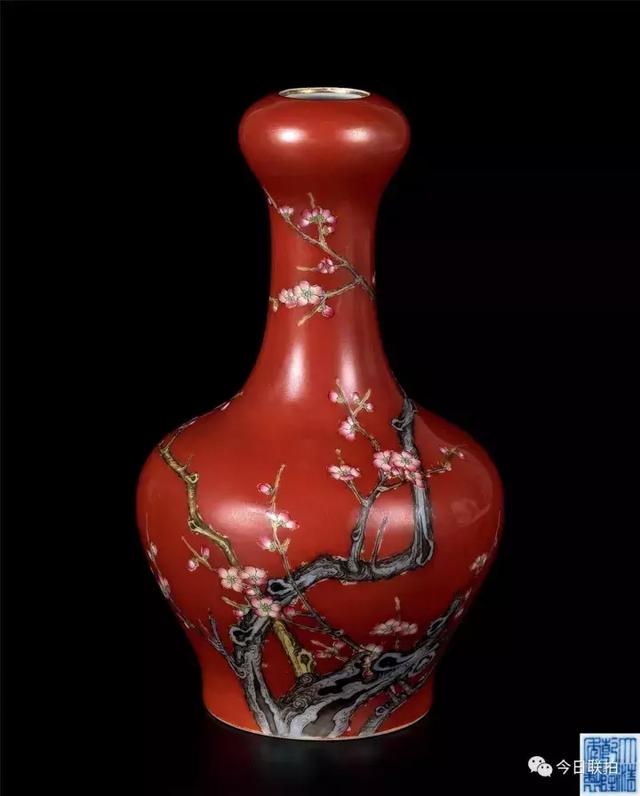 此蒜头瓶造型灵巧而不失沉稳庄重,瓶满施珊瑚红釉,浓艳深沉,并以粉彩绘梅花,化工精细遒丽,生动传神,施彩艳而不俗,腊梅报春的迹象喜庆题材,下至民间,上至宫廷都喜闻乐见,色彩艳丽的粉彩加之珊蝴红釉的衬托,愈加华丽高贵,寓意着春天的到来,万物复苏,一派欣欣向荣的景象,底书“大清乾隆年製”青花篆书款,工整有力,为乾隆官窑难得的精品,犹可珍之。