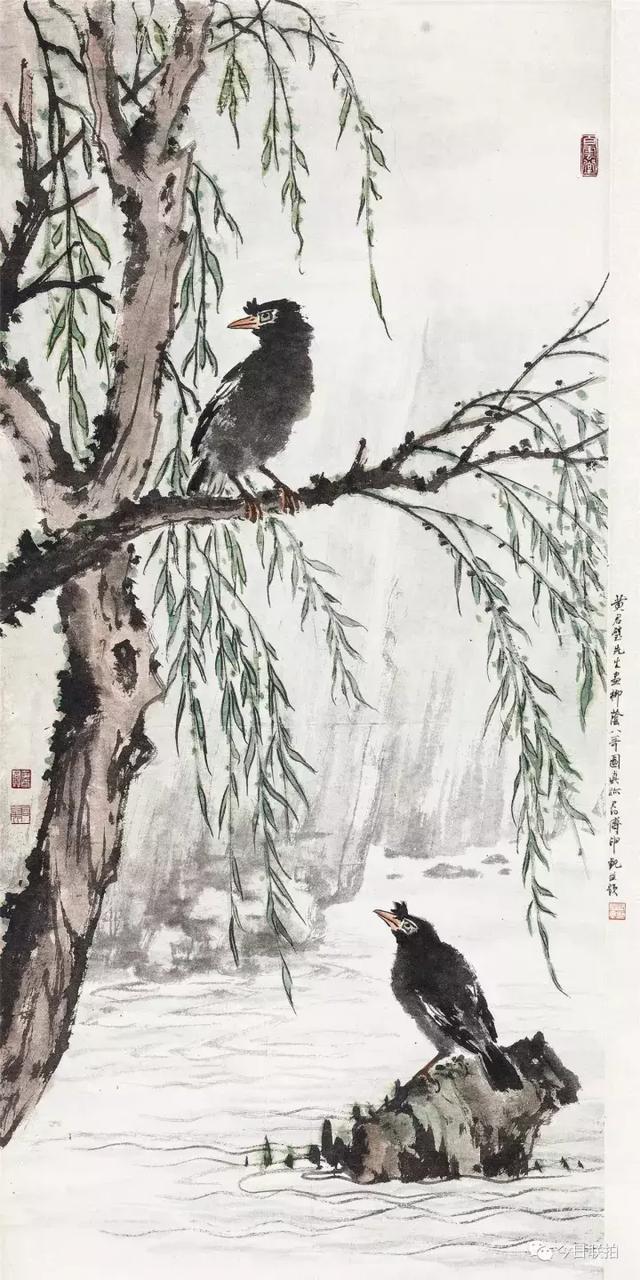 题识:黄君璧先生画柳荫八哥图真迹,君约傅申记并题。