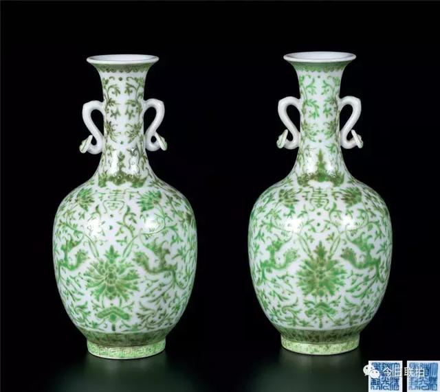 清道光 绿料彩宝相花如意耳长颈瓶(一对)