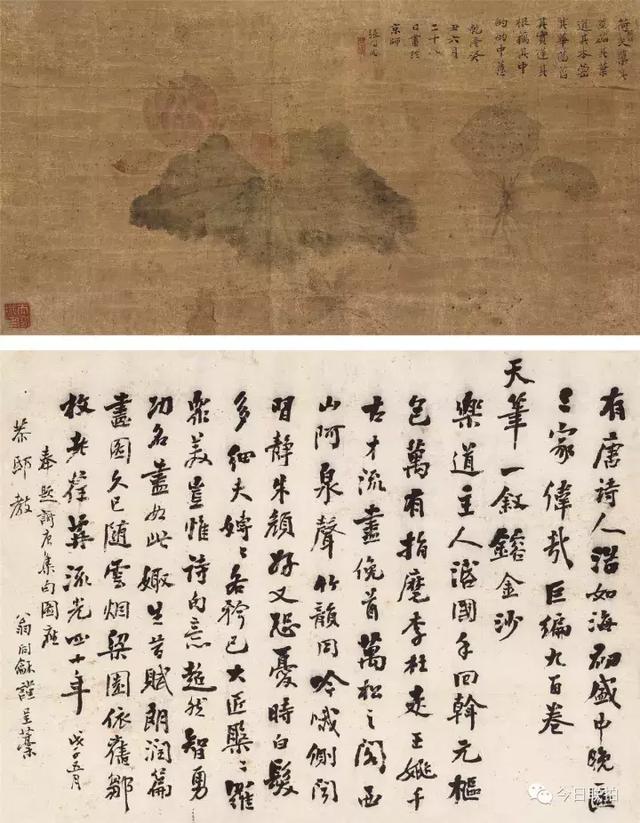 款识:荷,芙渠。其茎茄,其叶蕸,其本蔤,其华菡萏,其实莲,其根藕,其中的,的中薏。乾隆癸丑(1793年)六月二十八日画于京师。张问陶。奉题歌庚集句图应邸教。翁同龢谨呈稿。
