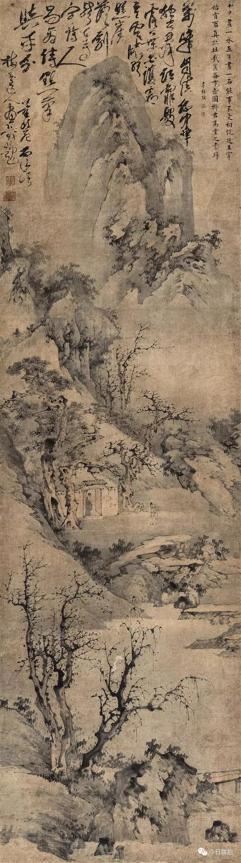 题跋:十日画一水,五日画一石。能事不受相促迫,王宰始肯留真迹。壮哉昆仑方壶图,挂君高堂之素壁。李梓瑶。