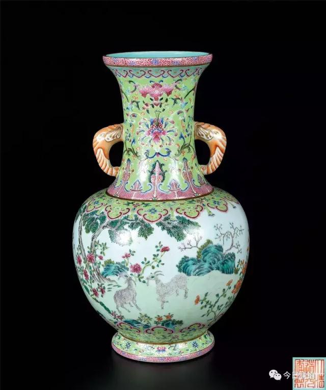 器撇口,长颈,溜肩,长圆腹,圈足外撇,颈部置对称象鼻耳,颈部粉地粉彩绘蝙蝠、戟罄、番莲纹样,肩部为如意云纹,象耳饰以金彩,腹部通景粉彩绘三羊开泰图,纹饰精美,色彩艳丽。底落“大清道光年製”篆书款。